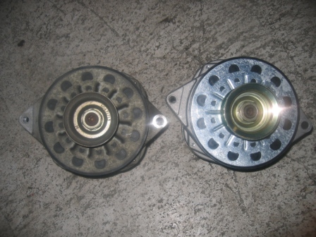 左が壊れたオルタネーター(>o<")プーリーを回してみるとカラカラとベアリングからも異音がしてました(+o+)